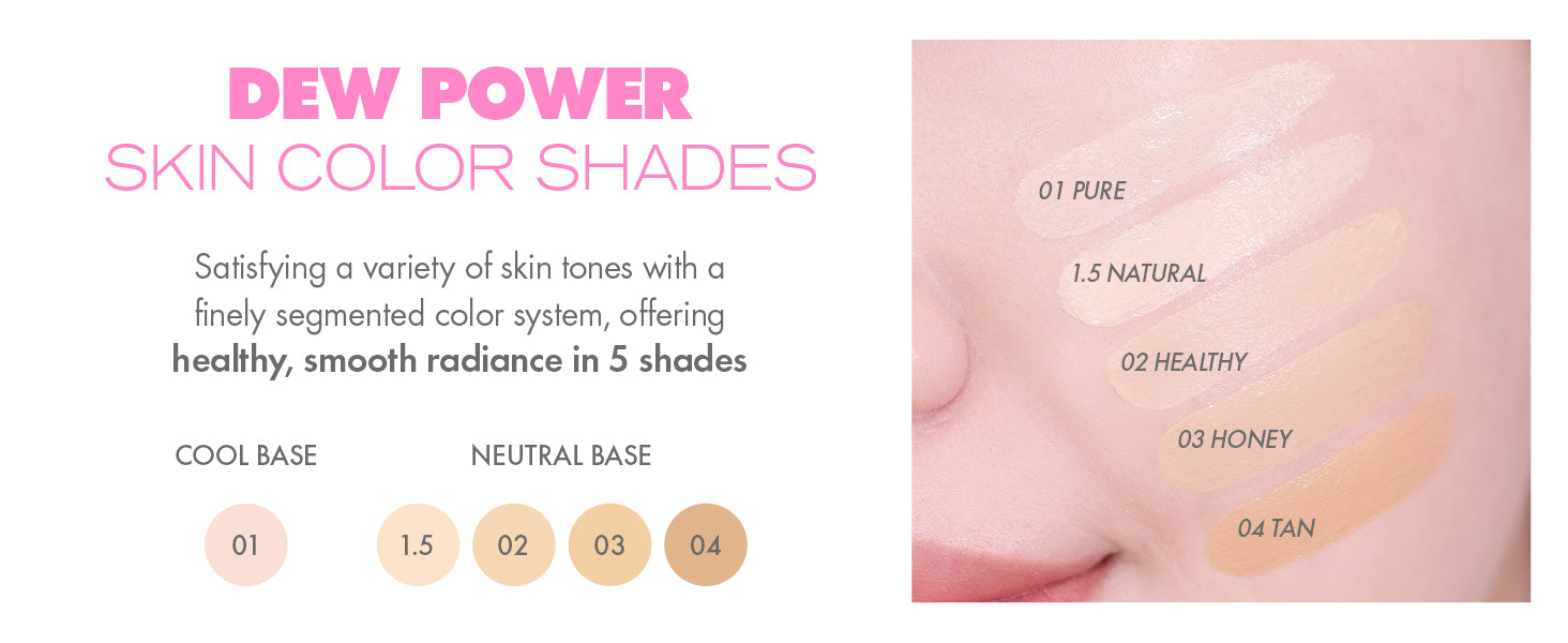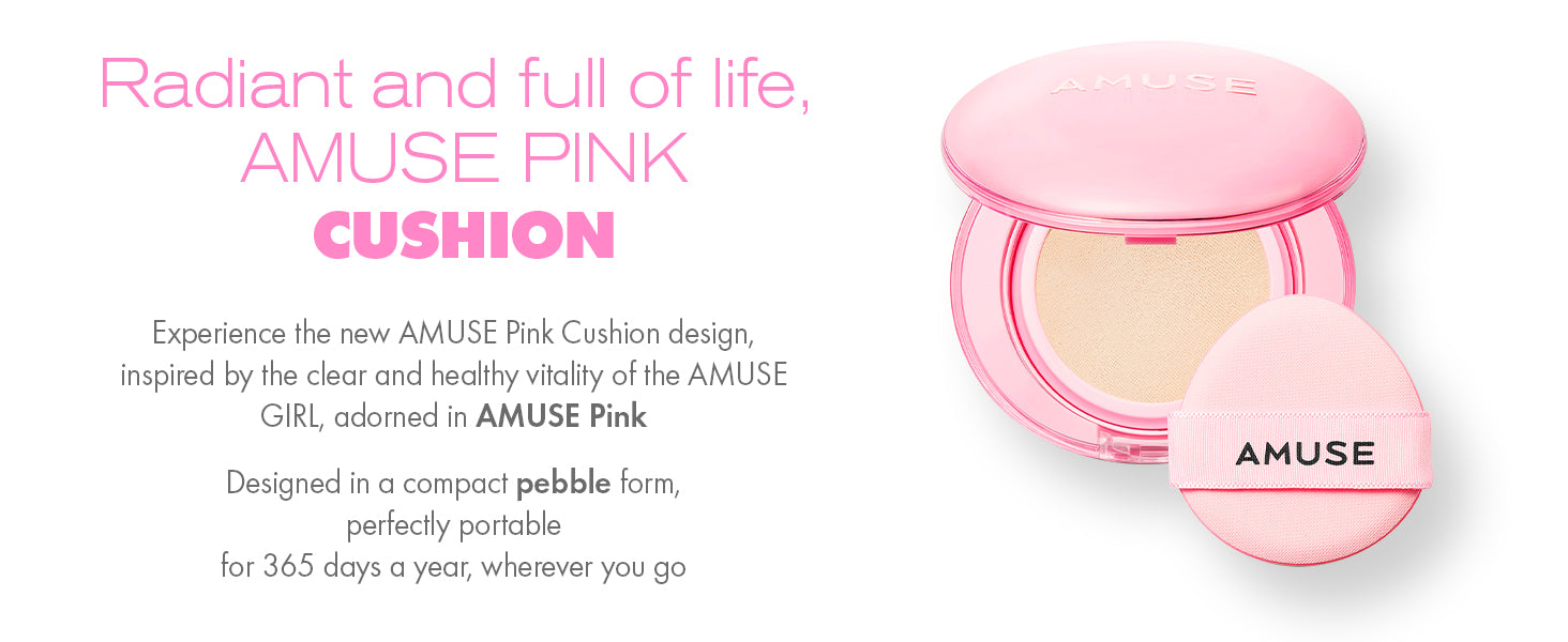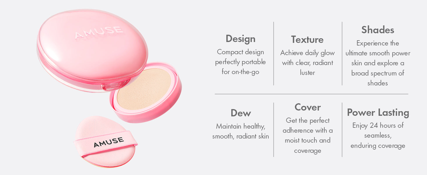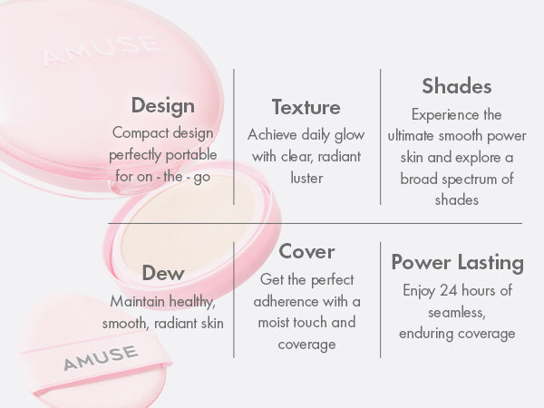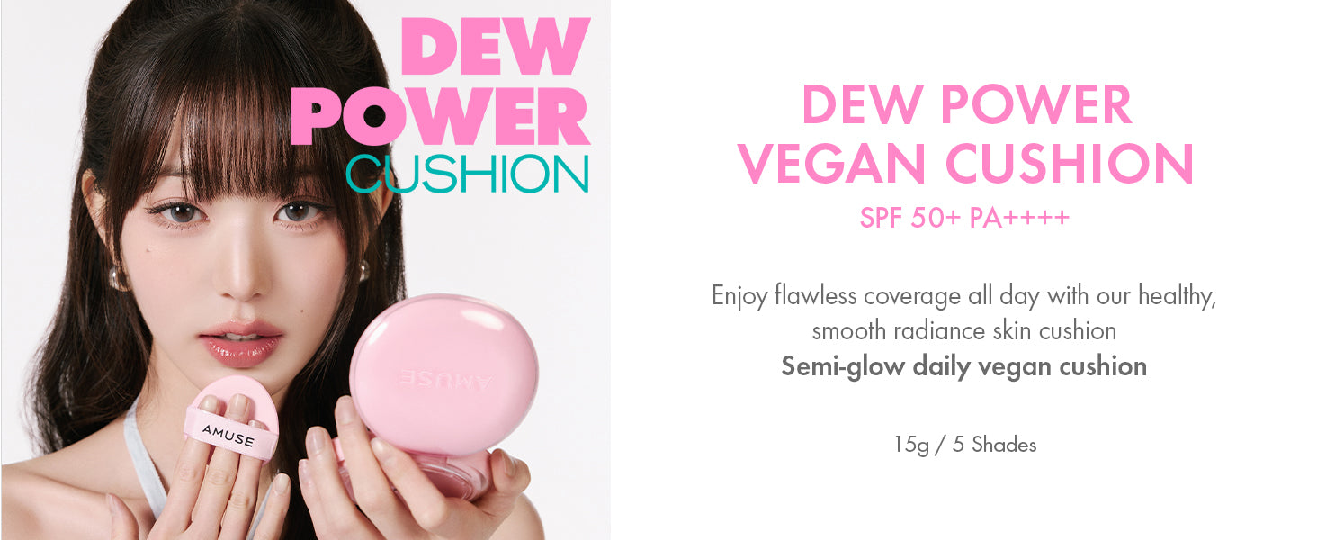 Flawless & dewy skin that lasts 24 hours - AMUSE DEW POWER CUSHION, a semi glow daily cushion foundation, makes a healthy, clear glow and smooth, elastic skin texture.